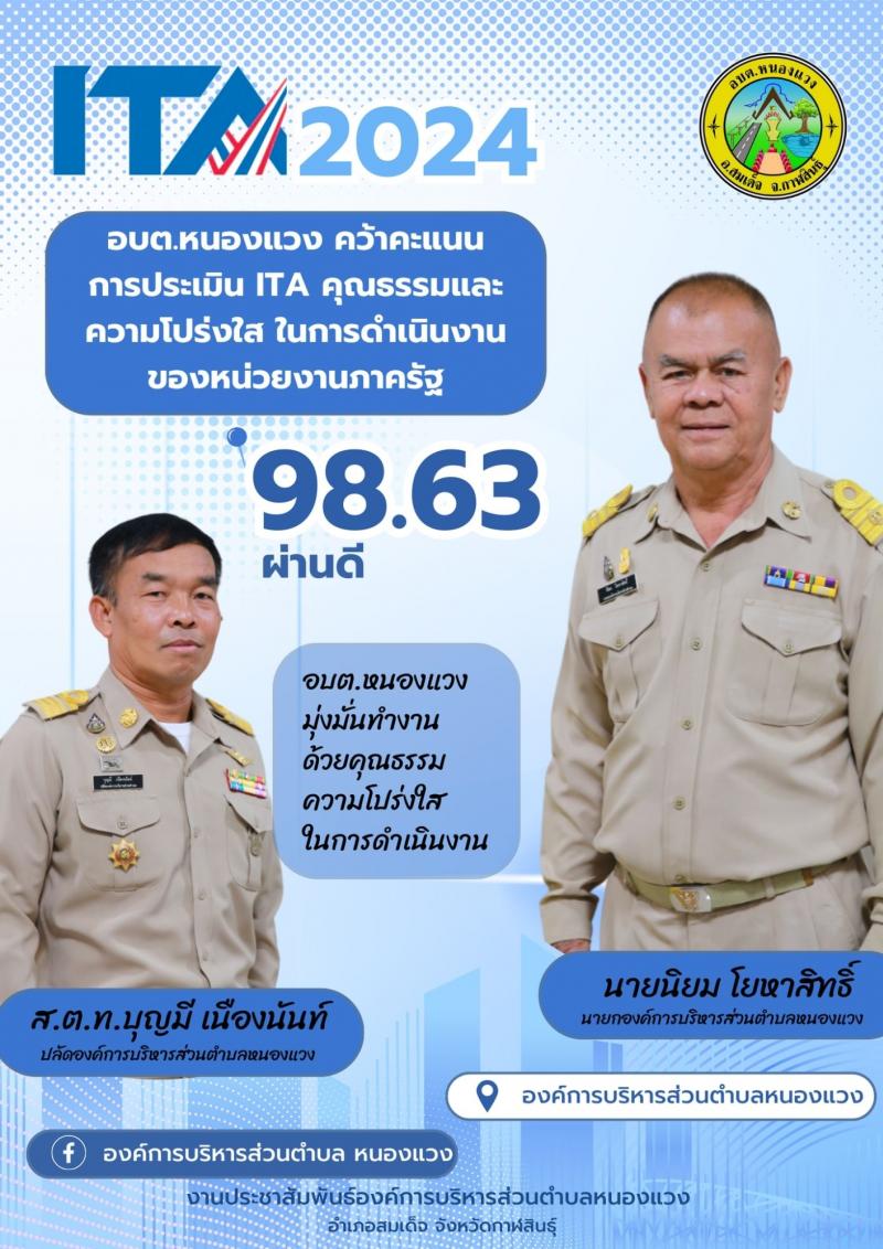 วันจันทร์ ที่ 9 ธันวาคม 2567 องค์การบริหารส่วนตำบลหนองแวง นำโดย นายนิยม โยหาสิทธิ์ นายกองค์การบริหารส่วนตำบลหนองแวง ส.ต.ท.บุญมี เนืองนันท์ ปลัดองค์การบริหารส่วนตำบลหนองแวง มอบหมายให้ ร้อยตรีจรูญ ฉายประดิษฐ์ รองนายกองค์การบริหารส่วนตำบลหนองแวง ร่วมงานวันต่อต้านคอร์รัปชันสากล (ประเทศไทย) จังหวัดกาฬสินธุ์ ประจำปี 2567 ณ ชั้น 4 ศาลากลางจังหวัดกาฬสินธุ์ ภายในงานได้มีพิธีมอบเกียรติบัตรการประเมินคุณธรรมและความโปร่งใสในการดำเนินงานของหน่วยงานภาครัฐ (Integrity and Transparency Assessment : ITA) โดยรับมอบเกียรติบัตรการประเมินฯ ระดับ AA คะแนน 98.63