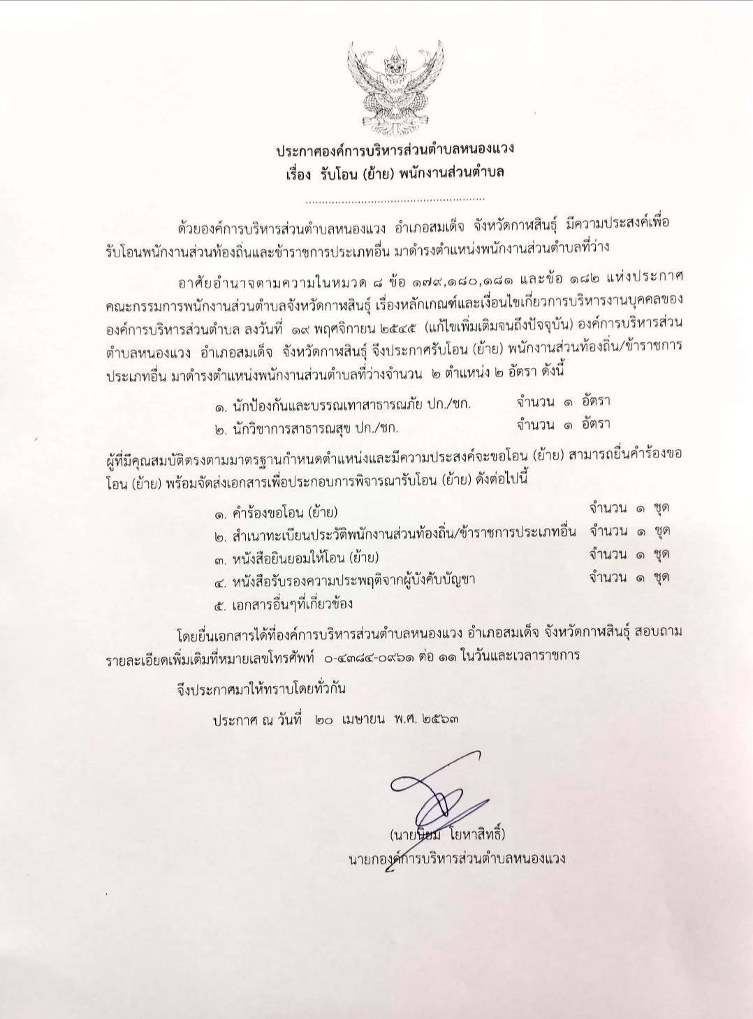 ประกาศองค์การบริหารส่วนตำบลหนองแวง เรื่อง รับโอน (ย้าย) พนักงานส่วนตำบล