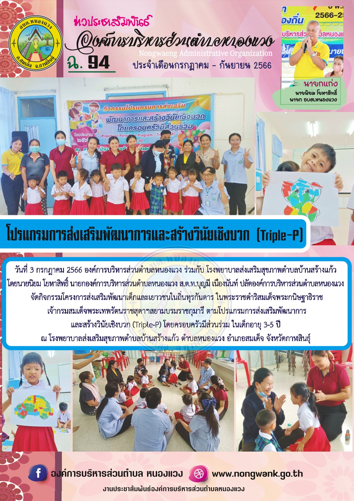องค์การบริหารส่วนตำบลหนองแวง โดย นายนิยม โยหาสิทธิ์ นายกองค์การบริหารส่วนตำบลหนองแวง ส.ต.ท.บุญมี เนืองนันท์ ปลัดองค์การบริหารส่วนตำบลหนองแวง นางบุศรินทร์ ซื่อสัตย์ รองปลัดองค์การบริหารส่วนตำบลหนองแวง นางนิตยา สินธุโคตร ผู้อำนวยการกองการศึกษา จัดโครงการปฐมนิเทศและประชุมผู้ปกครอง ประจำปี 2566 ของศูนย์พัฒนาเด็กเล็กในสังกัดองค์การบริหารส่วนตำบลหนองแวงเพื่อให้ผู้ปกครองได้มีโอกาสพบปะกับครู แลกเปลี่ยนเรียนรู้ร่วมกัน ซึ่งจะนำไปสู่ความร่วมมือในการดูแลช่วยเหลือนักเรียนและร่วมกันส่งเสริมพัฒนา ป้องกัน และแก้ไขปัญหาของนักเรียนที่เกิดขึ้น