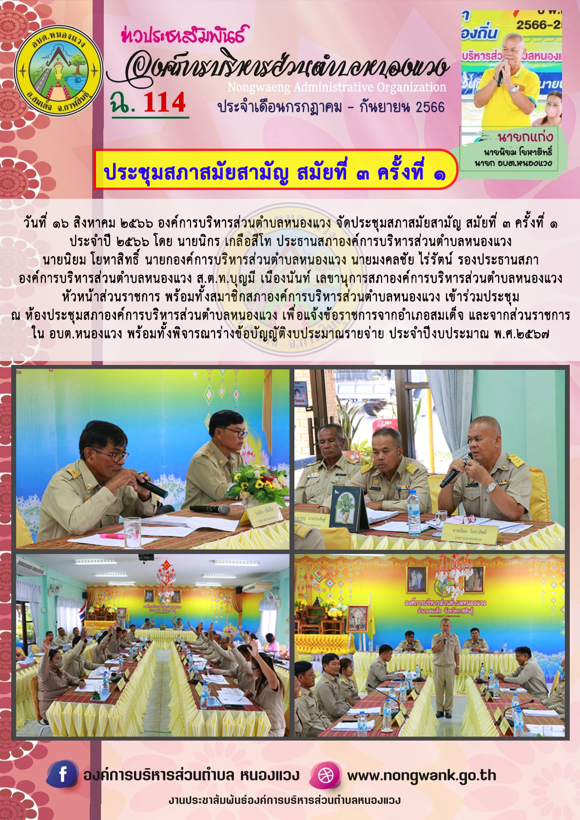 วันที่ ๑๕ สิงหาคม ๒๕๖๖ ที่ผ่านมา องค์การบริหารส่วนตำบลหนองแวง จัดประชุมสภา สมัยสามัญ สมัยที่ ๓ ครั้งที่ ๑ ประจำปี ๒๕๖๖ โดย นายนิกร เกลือสีโท ประธานสภาองค์การบริหารส่วนตำบลหนองแวง นายนิยม โยหาสิทธิ์ นายกองค์การบริหารส่วนตำบลหนองแวง นายมงคลชัย ไร่รัตน์ รองประธานสภาองค์การบริหารส่วนตำบลหนองแวง ส.ต.ท.บุญมี เนืองนันท์ เลขานุการสภาองค์การบริหารส่วนตำบลหนองแวง หัวหน้าส่วนราชการ พร้อมทั้งสมาชิกสภาองค์การบริหารส่วนตำบลหนองแวง เข้าร่วมประชุม ณ ห้องประชุมสภาองค์การบริหารส่วนตำบลหนองแวง เพื่อแจ้งข้อราชการจากอำเภอสมเด็จ และจากส่วนราชการใน อบต.หนองแวง พร้อมทั้งพิจารณาร่างข้อบัญญัติงบประมาณรายจ่าย ประจำปีงบประมาณ พ.ศ.๒๕๖๗