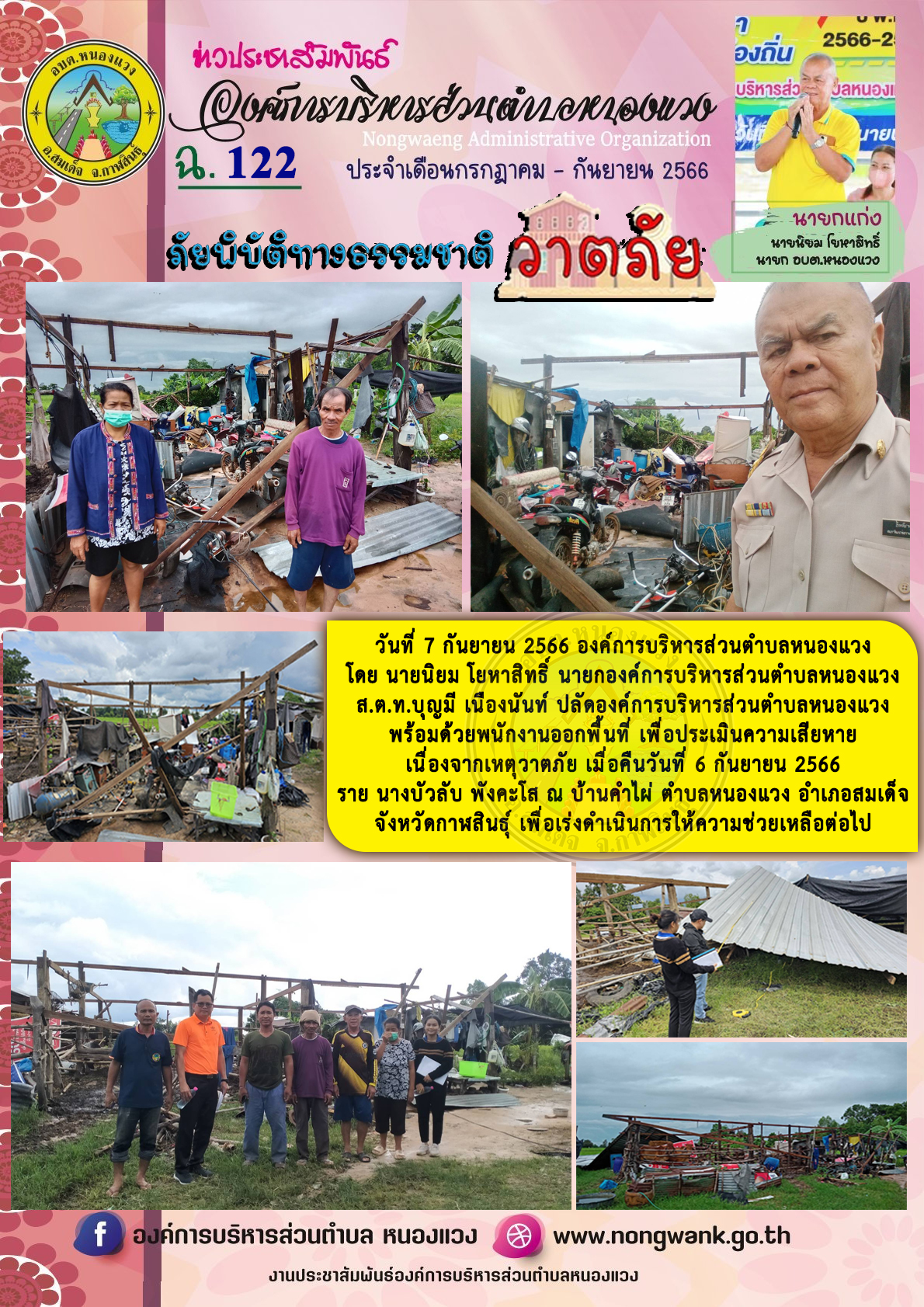 วันที่ 7 กันยายน 2566 องค์การบริหารส่วนตำบลหนองแวง โดย นายนิยม โยหาสิทธิ์ นายกองค์การบริหารส่วนตำบลหนองแวง ส.ต.ท.บุญมี เนืองนันท์ ปลัดองค์การบริหารส่วนตำบลหนองแวง ออกพื้นที่ เนื่องจากเมื่อคืนวันที่ 6 กันยายน 2566 ที่ผ่านมา เกิดเหตุวาตภัย ราย นางบัวลับ พังคะโส ณ บ้านคำไผ่ ตำบลหนองแวง อำเภอสมเด็จ จังหวัดกาฬสินธุ์ เพื่อเป็นขวัญกำลังใจแก่ผู้ประสบเหตุ และเร่งดำเนินการให้ความช่วยเหลือต่อไป