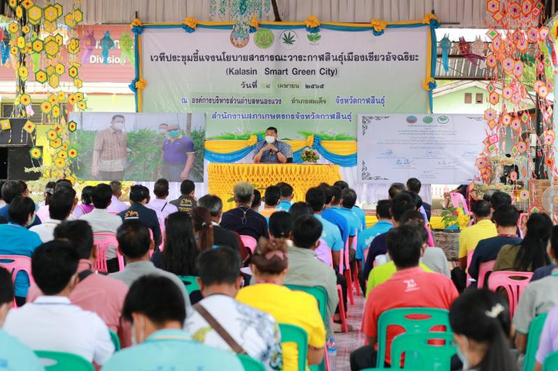 วันที่ 8 เมษายน 2565 จังหวัดกาฬสินธุ์ จัดเวทีประชุมชี้แจงนโยบายสาธารณะ วาระกาฬสินธุ์เมืองสีเขียว (Kalasin Smart Green City) ณ องค์กรการบริหารส่วนตำบลหนองแวง อำเภอสมเด็จ จังหวัดกาฬสินธุ์ นายทรงพล ใจกริ่ม ผู้ว่าราชการจังหวัดกาฬสินธุ์ เป็นประธานในพิธีเปิดและประกาศนโยบายสาธารณะวาระกาฬสินธุ์เมืองสีเขียว (Kalasin Smart Green City) โดยมี นายอดิศร วิทูรศิลป์ นายอำเภอสมเด็จ ดร.นิรุจน์ อุทธา หัวหน้าสำนักงานสภาเกษตรจังหวัดกาฬสินธุ์ นายนิยม โยหาสิทธิ์ นายกองค์กรการบริหารส่วนตำบลหนองแวง ส.ต.ท.บุญมี เนืองนันท์ ปลัดองค์กรการบริหารส่วนตำบลหนองแวง และประธานกลุ่มเกษตรภายในอำเภอสมเด็จ เข้าร่วมรับฟังนโยบายครั้งนี้