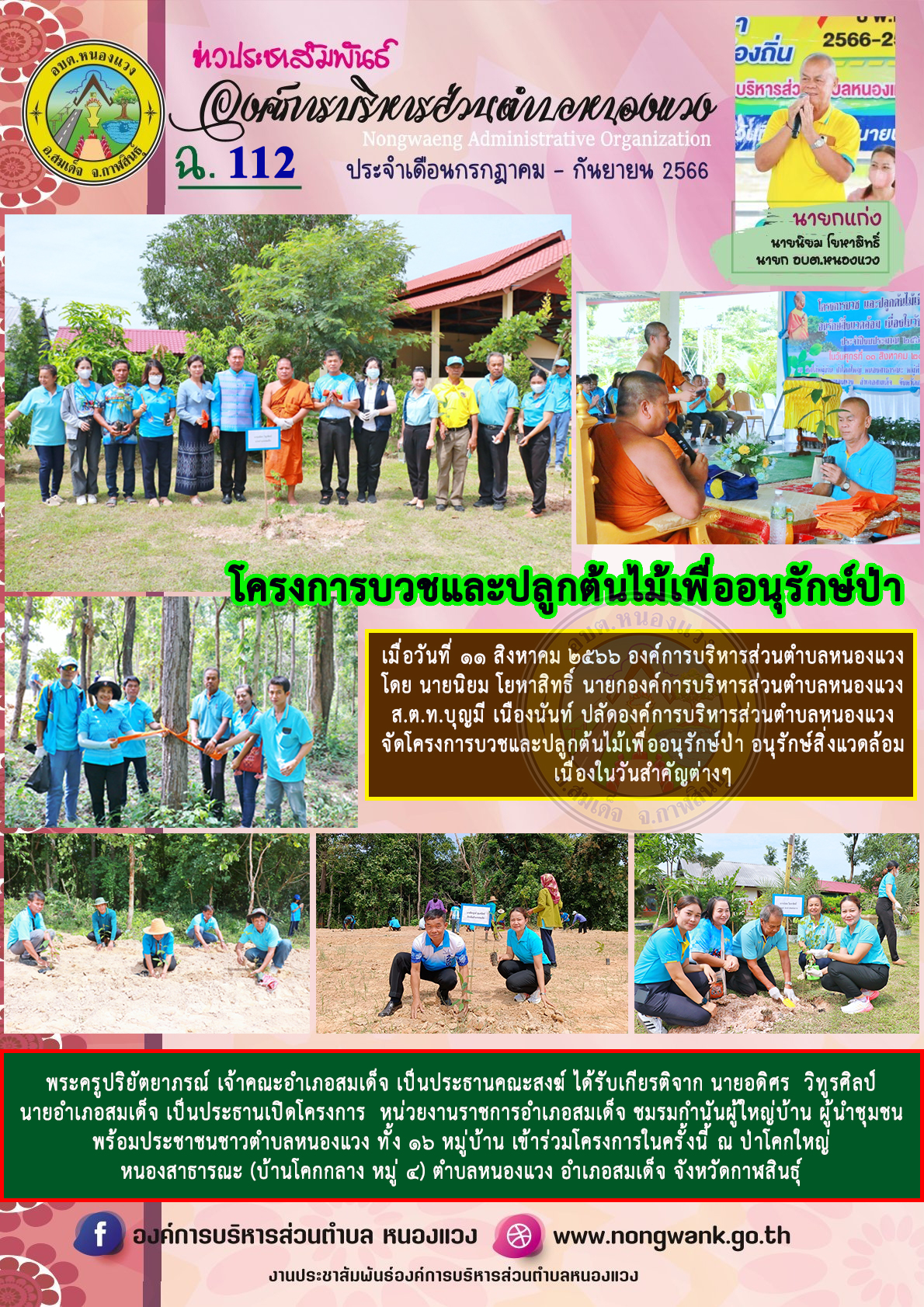 วันที่ ๑๑ สิงหาคม ๒๕๖๖ องค์การบริหารส่วนตำบลหนองแวง โดย นายนิยม โยหาสิทธิ์ นายกองค์การบริหารส่วนตำบลหนองแวง ส.ต.ท.บุญมี เนืองนันท์ ปลัดองค์การบริหารส่วนตำบลหนองแวง จัดโครงการบวชและปลูกต้นไม้เพื่ออนุรักษ์ป่า อนุรักษ์สิ่งแวดล้อม เนื่องในวันสำคัญต่างๆ ประจำปีงบประมาณ ๒๕๖๖