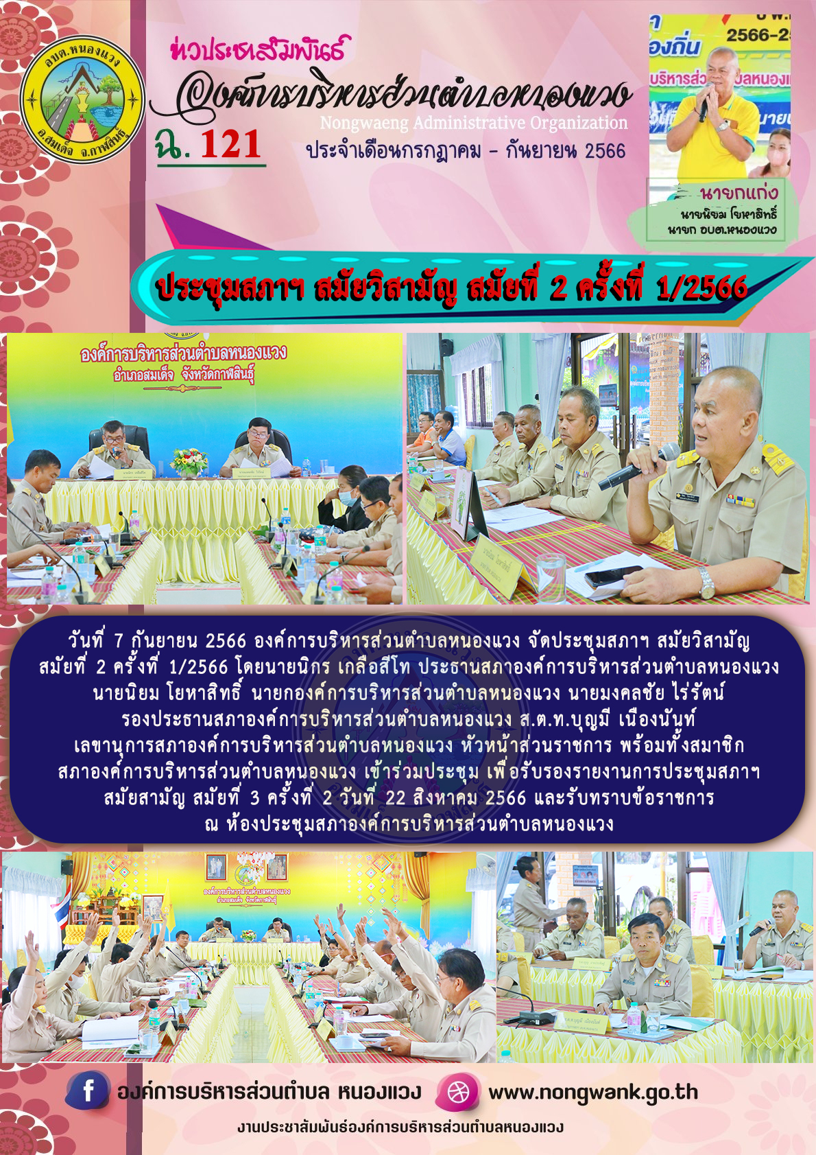 วันที่ 7 กันยายน 2566 องค์การบริหารส่วนตำบลหนองแวง จัดประชุมสภาฯ สมัยวิสามัญ สมัยที่ 2 ครั้งที่ 1/2566 โดยนายนิกร เกลือสีโท ประธานสภาองค์การบริหารส่วนตำบลหนองแวง นายนิยม โยหาสิทธิ์ นายกองค์การบริหารส่วนตำบลหนองแวง นายมงคลชัย ไร่รัตน์ รองประธานสภาองค์การบริหารส่วนตำบลหนองแวง ส.ต.ท.บุญมี เนืองนันท์ เลขานุการสภาองค์การบริหารส่วนตำบลหนองแวง หัวหน้าส่วนราชการ พร้อมทั้งสมาชิกสภาองค์การบริหารส่วนตำบลหนองแวง เข้าร่วมประชุม เพื่อรับรองรายงานการประชุมสภาฯ สมัยสามัญ สมัยที่ 3 ครั้งที่ 2 วันที่ 22 สิงหาคม 2566 และรับทราบข้อราชการ ณ ห้องประชุมสภาองค์การบริหารส่วนตำบลหนองแวง